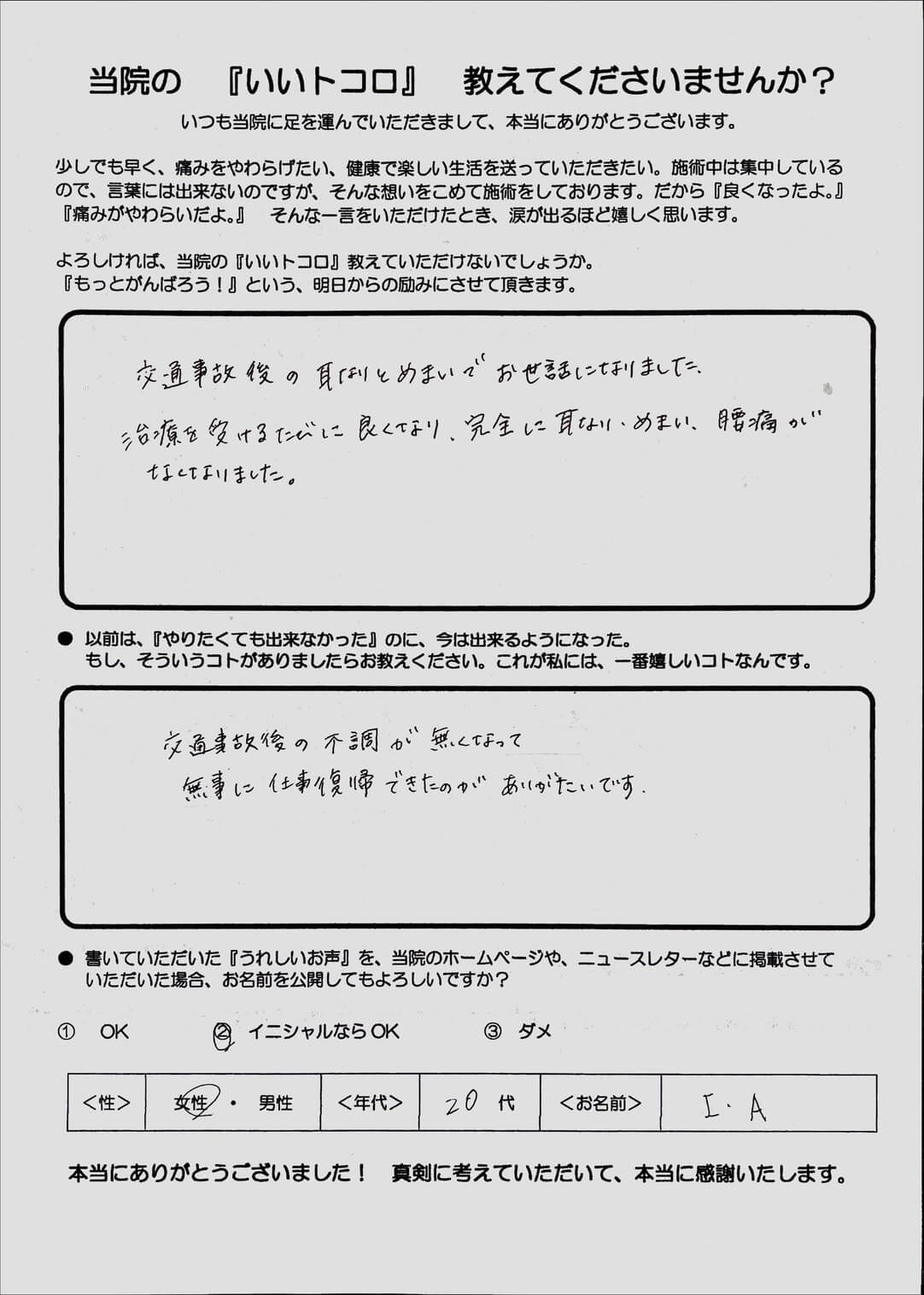 交通事故後の耳鳴りとめまい治療を受けるたびによくなりました!