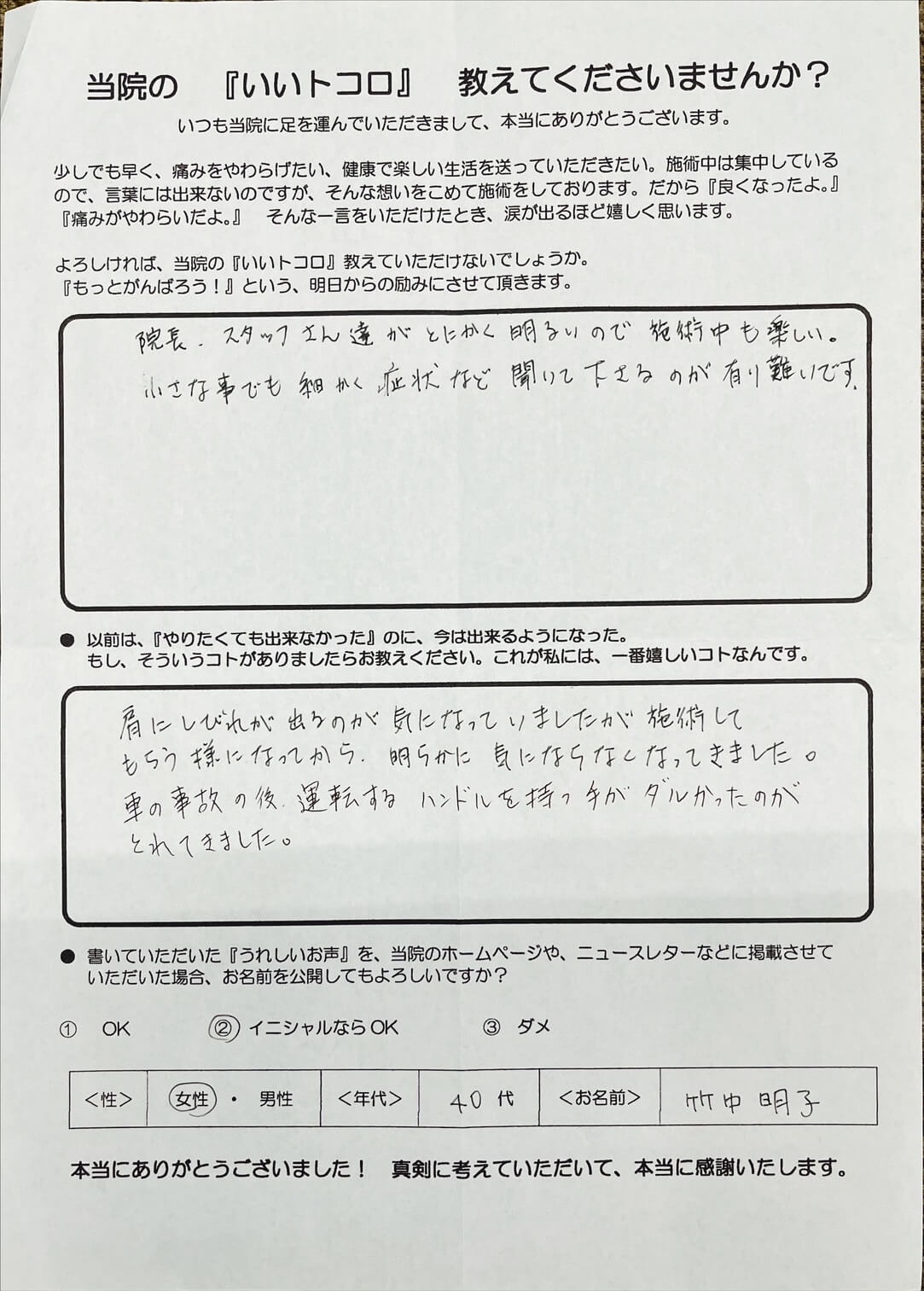 交通事故の後、運転するハンドルを持つ手がだるかったのがとれてきました!
