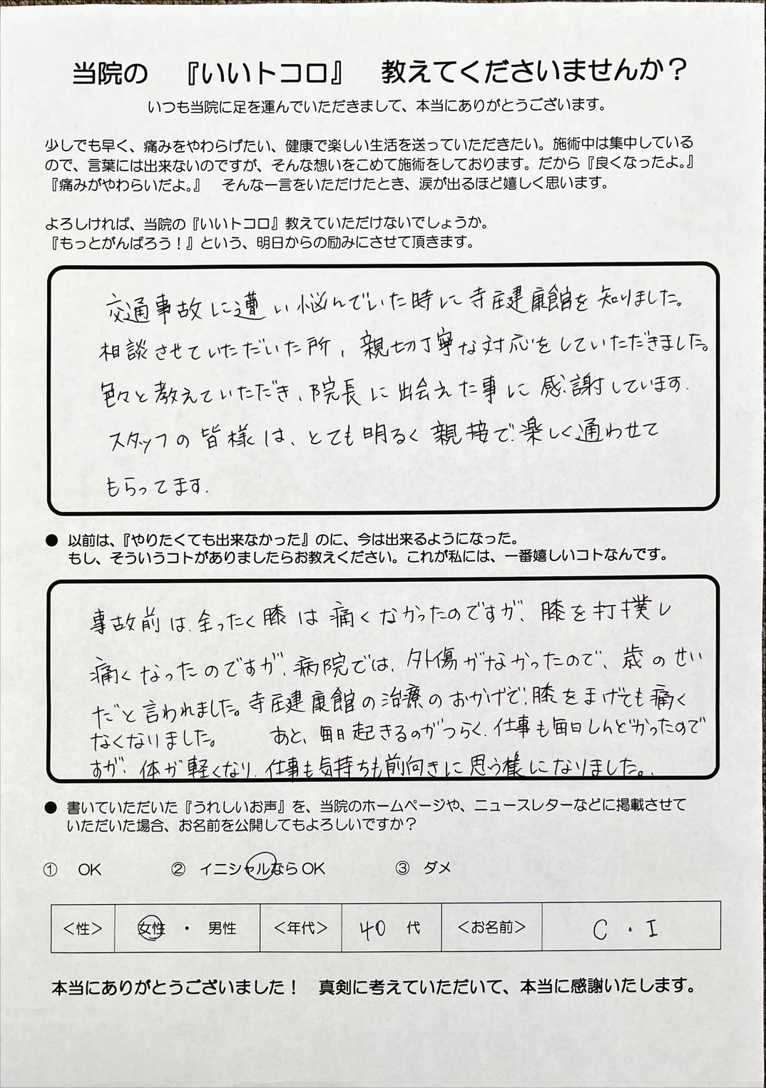 よって、総合病院・整形外科、または他の整骨院などから、寺庄健康館•整骨院に移って施術を受けている方は、たくさんおられます。