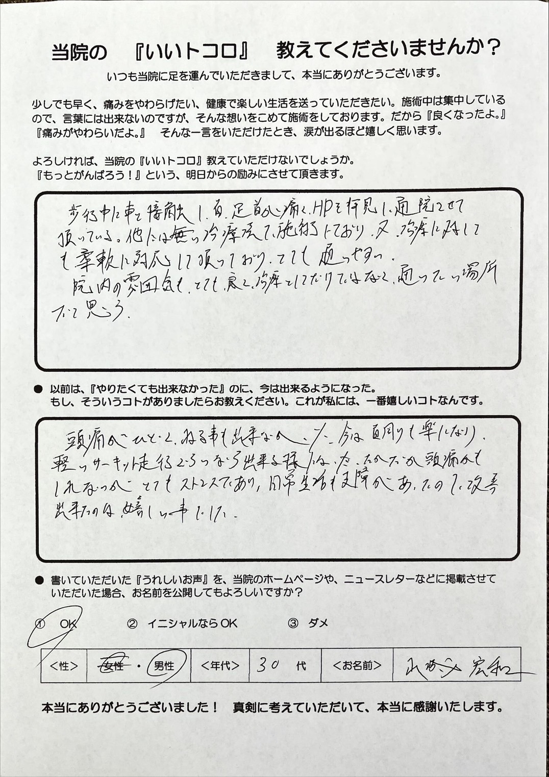 首は痛いし頭痛が頻発する。もう仕事にならない状態。薬を飲み続けるのも怖い。 そんな時に同僚に連れていかれた接骨院で治療を受けたら、一気に良くなって、また問題なく普通に働けるように戻れました。